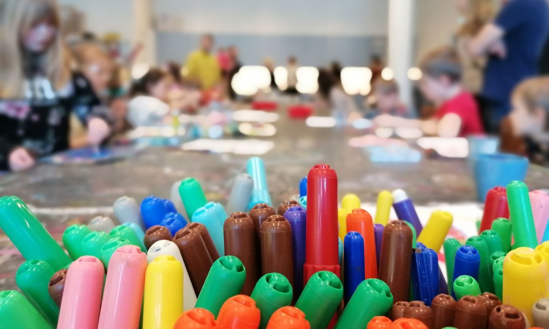 Barn målar är en aktivitet för barn upp till 12 år med vuxet sällskap. Det finns färger, papper, penslar, rollar, och stafflier. Handledare finns på plats. Under dagen kan man också besöka vernissagen för ny utställning i Konsthallen.